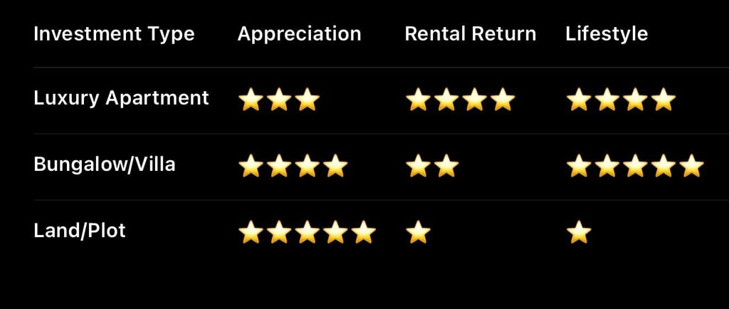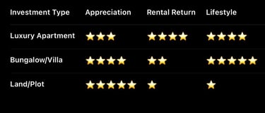 Which One Should You Choose? ✔ If you want modern amenities & hassle-free living → Go for a Luxury Apartment ✔ If you want space, privacy & prestige → A Bungalow/Villa is perfect ✔ If you want maximum long-term growth → Land is the strongest asset Every category has its own strength